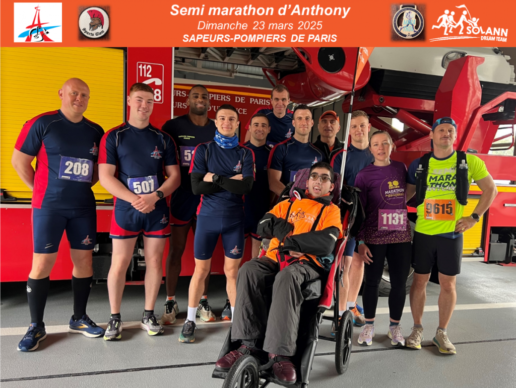 Des pompiers de Paris de la caserne ce Clamart et d’Anthony ont formé une équipe pour accompagner Solann sur le parcours du semi-marathon d’ANTHONY